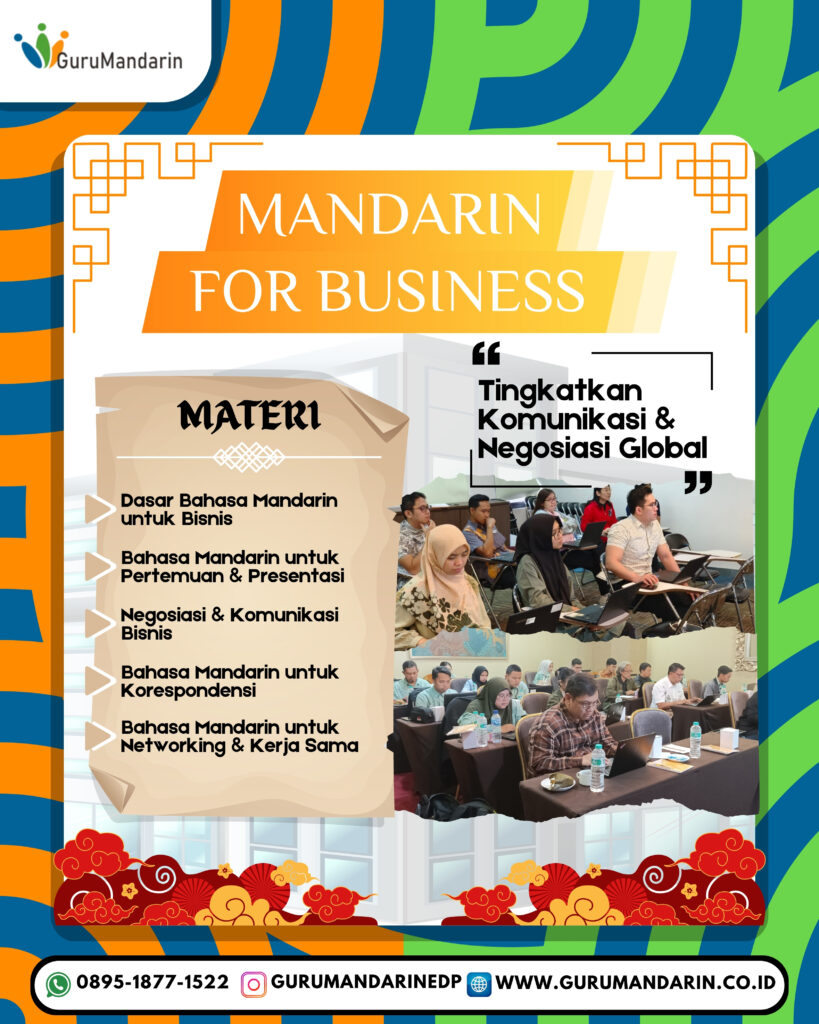 Mandarin for Business adalah program pembelajaran bahasa Mandarin yang difokuskan untuk kebutuhan bisnis, komunikasi profesional, dan pengembangan karir di era global. Dengan menguasai bahasa Mandarin untuk dunia kerja, Anda tidak hanya menambah keterampilan bahasa, tetapi juga memperluas jaringan, meningkatkan kepercayaan diri, serta membuka pintu peluang bisnis internasional yang lebih luas.